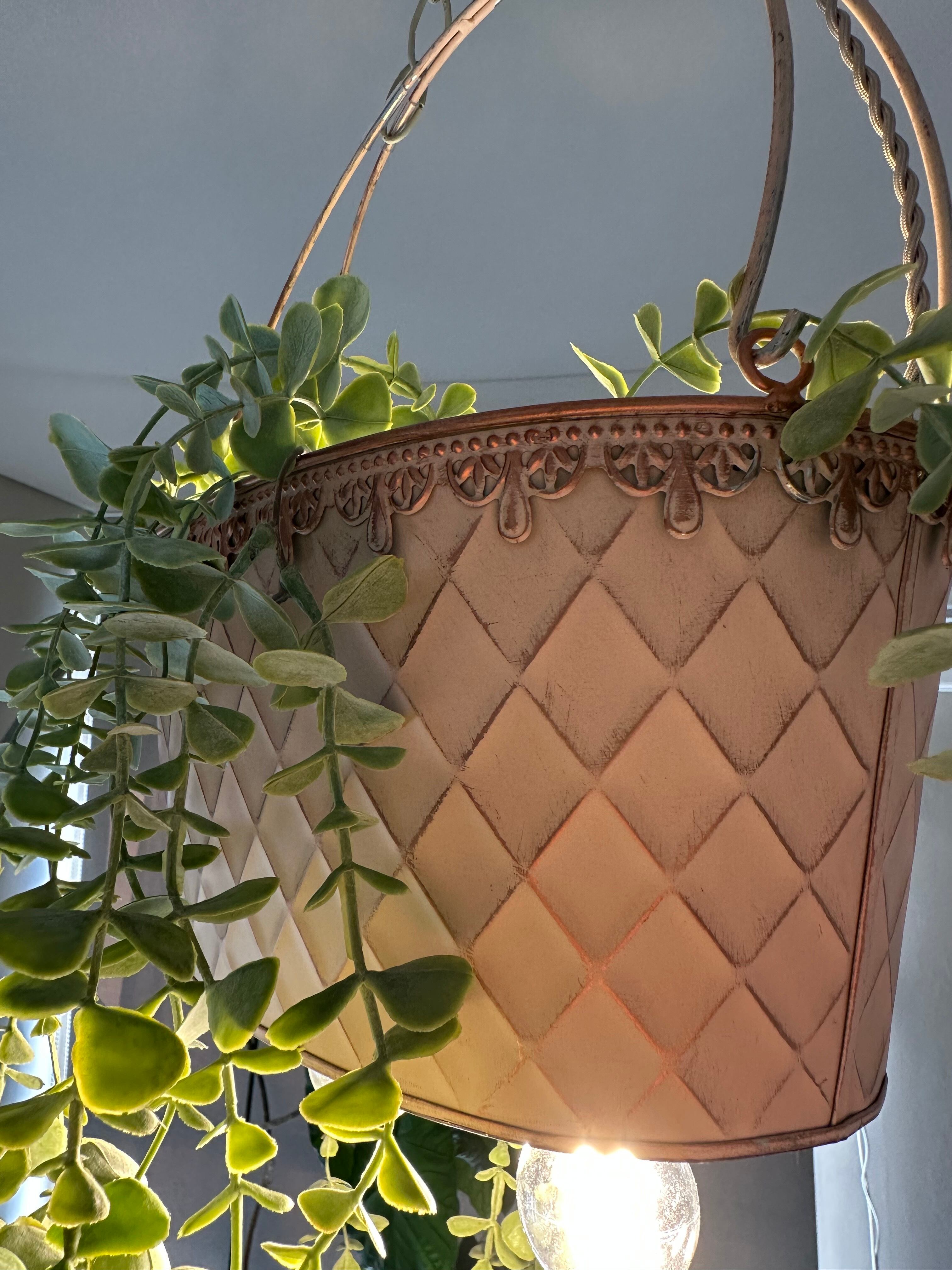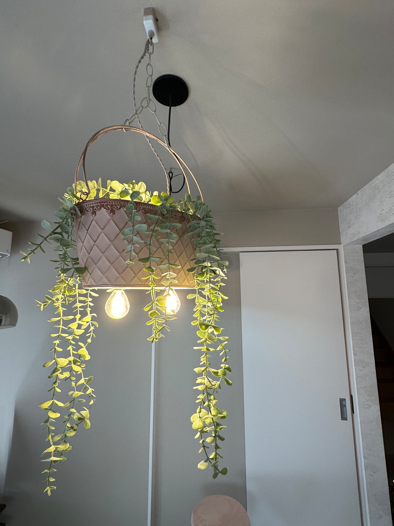 アンティーク風のブリキのシェードからフェイクグリーンが垂れ下がり空間のアクセントになります。
