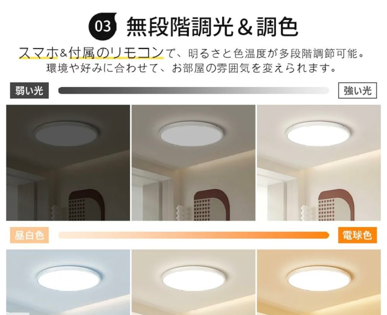 こちらのシーリングライトは、多段階調光調色で、 電球色/昼白色/昼光色/常夜灯/常夜灯+昼白色+昼光色など、リモコン1つで明るさを変換できるので、リビング・ダイニング・寝室・書斎などさまざまな空間に適しています。