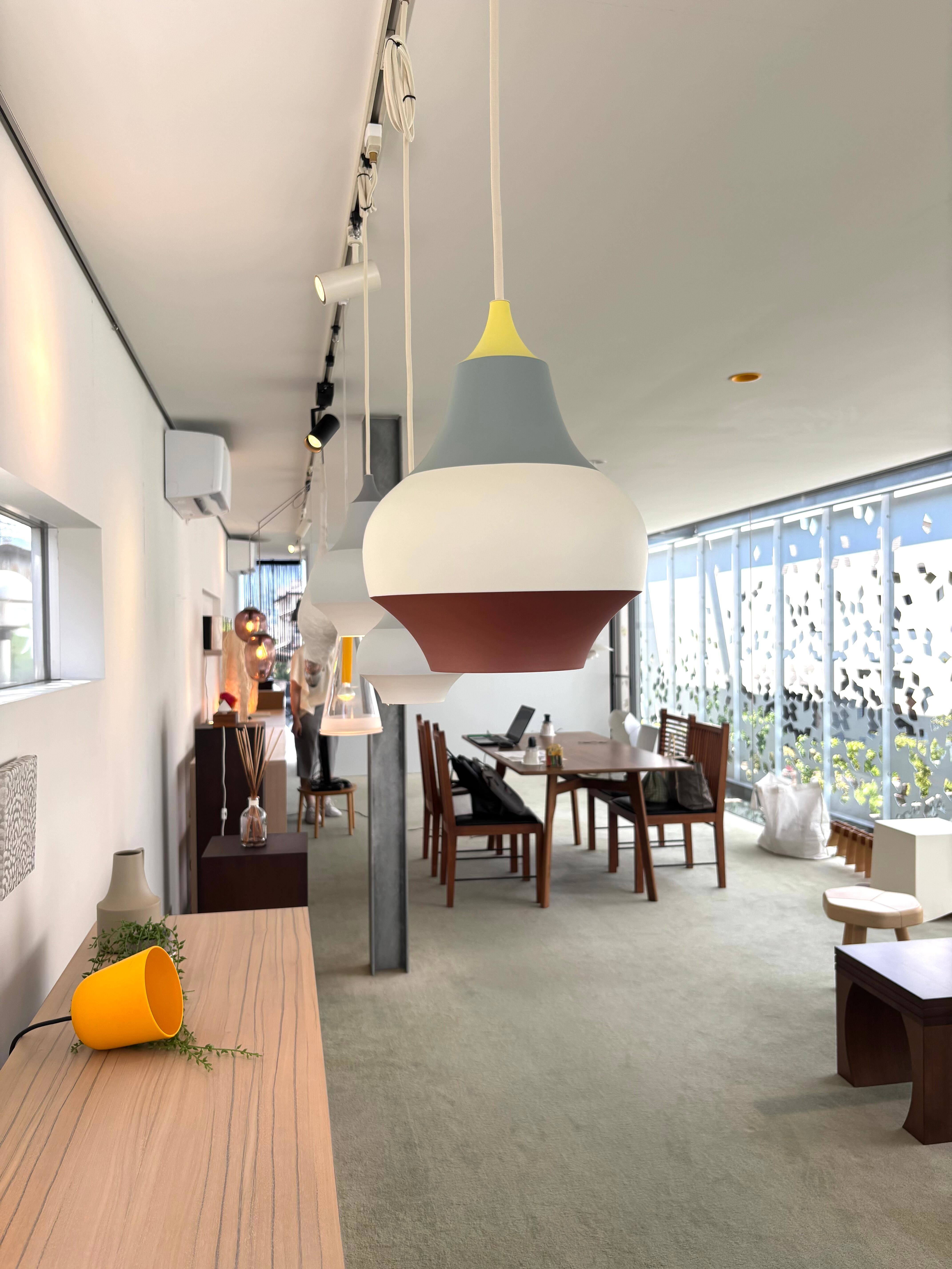光源の直接光とシェード内部の反射光が合わさって下向きに広がり、通常の高さではグレアのまったくない、落ち着いた照明となります。強い直接光で下方を照らすので、ダイニングテーブルに、あるいは部屋のコーナーにまとめて低く吊り下げるのがおすすめです。