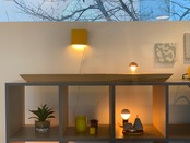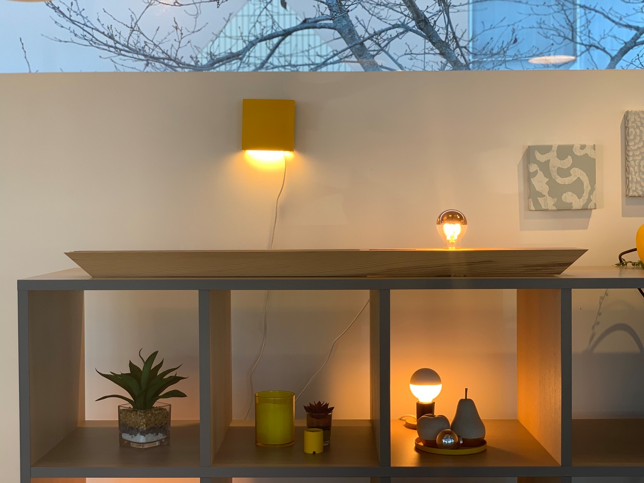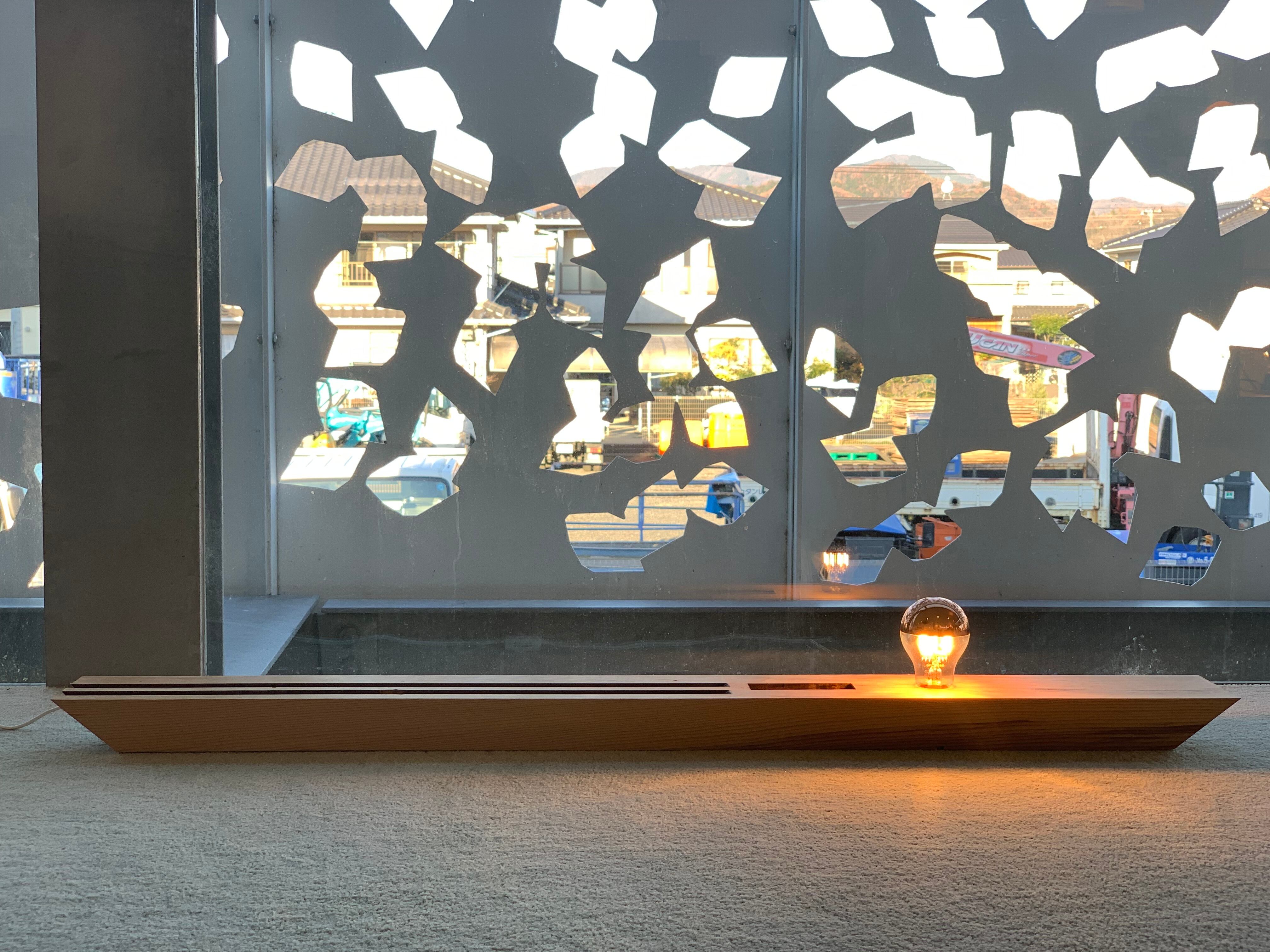 スタンド部分は、古民家の鴨居部分を使っており、しっかり安定感のある古材です。ハーフミラー部分の電球色はcopperを付けておりますので、非常にスタンドとの馴染みが良く落ち着いた雰囲気です。