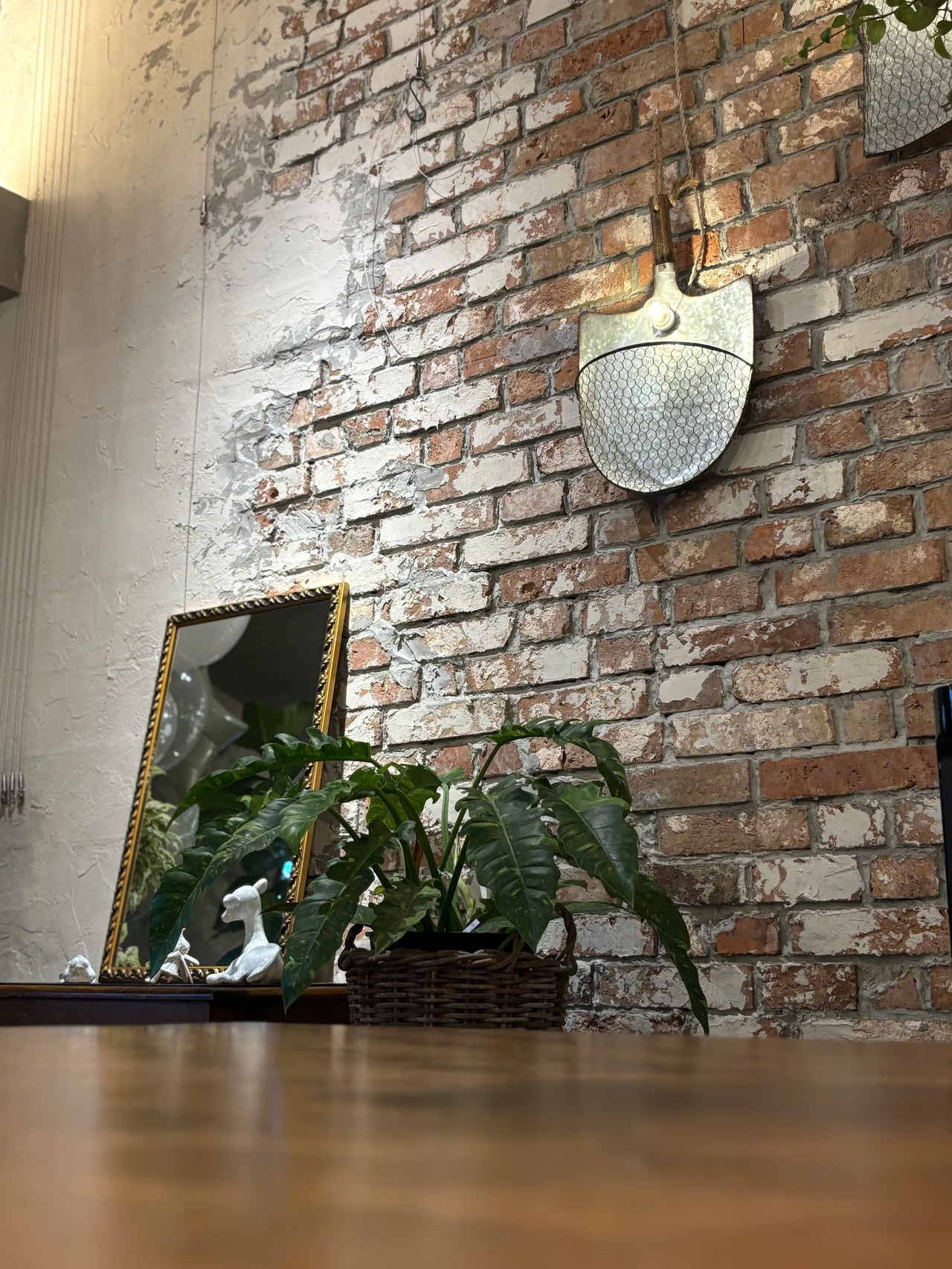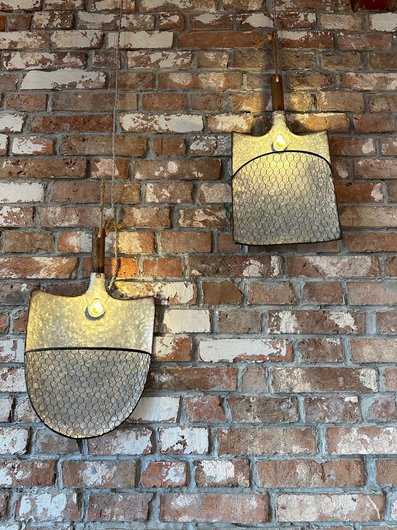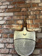 スコップの形をした壁掛けタイプのランプとなっており、全体は渋めのアンティーク風仕上で趣きがあります。ネット部分はお好みで植物を飾ったり、小物を入れたりとインテリアとして楽しむことができます。